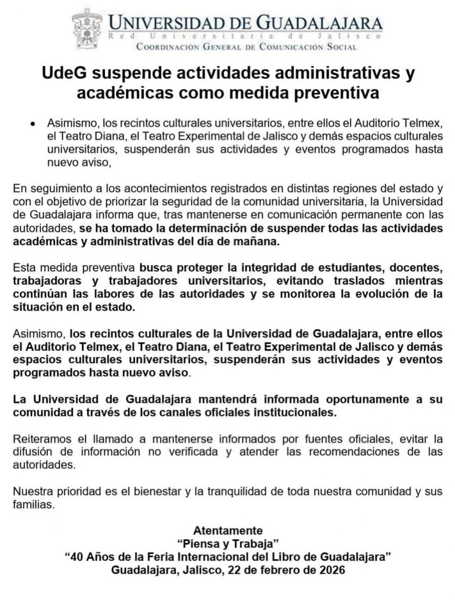 En seguimiento a los acontecimientos registrados en distintas regiones del estado y con el objetivo de priorizar la seguridad de la comunidad universitaria, la Universidad de Guadalajara informa que, tras mantenerse en comunicación permanente con las autoridades, se ha tomado la determinación de suspender todas las actividades académicas y administrativas del día de mañana.